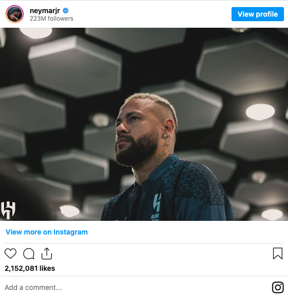 لیست ما با نیمار جونیور، بازیکن برزیلی تیم الهلال عربستان، شروع میشود. او در اکانت خود پستهایی درباره ورزش حرفهای، تصاویری از خانواده و همکاریهایی که با برندهای مشهور انجام میدهد، منتشر میکند.