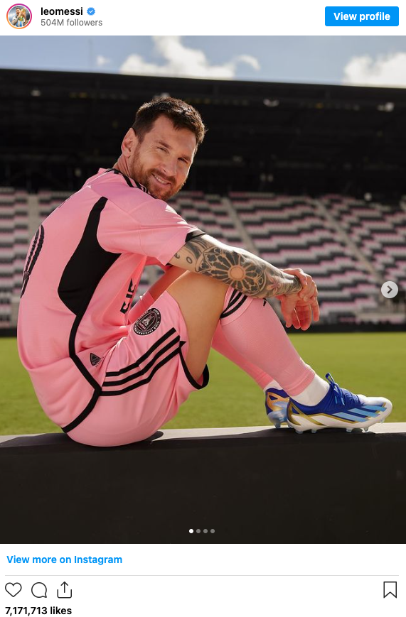 خب، به دومین فوتبالیست این لیست و دارنده بیشترین تعداد توپ طلای دنیا، لیونل مسی رسیدیم. مسی اکنون در باشگاه اینتر میامی آمریکا و تیم ملی آرژانتین بازی میکند. در اکانت او میتوانید تصاویر زیادی از بازیها، زندگی شخصی و تبلیغات برندهای مختلف وجود دارد.